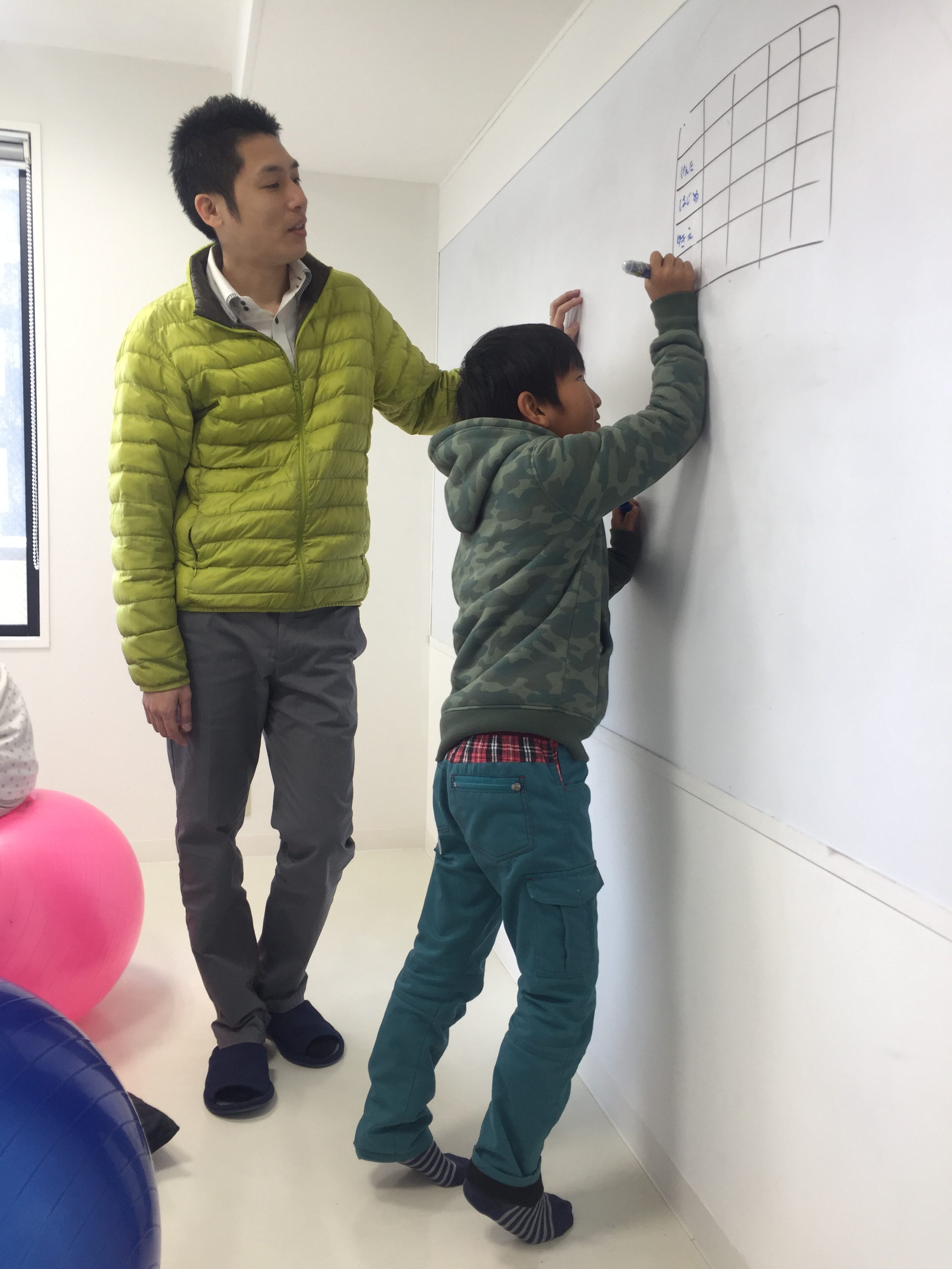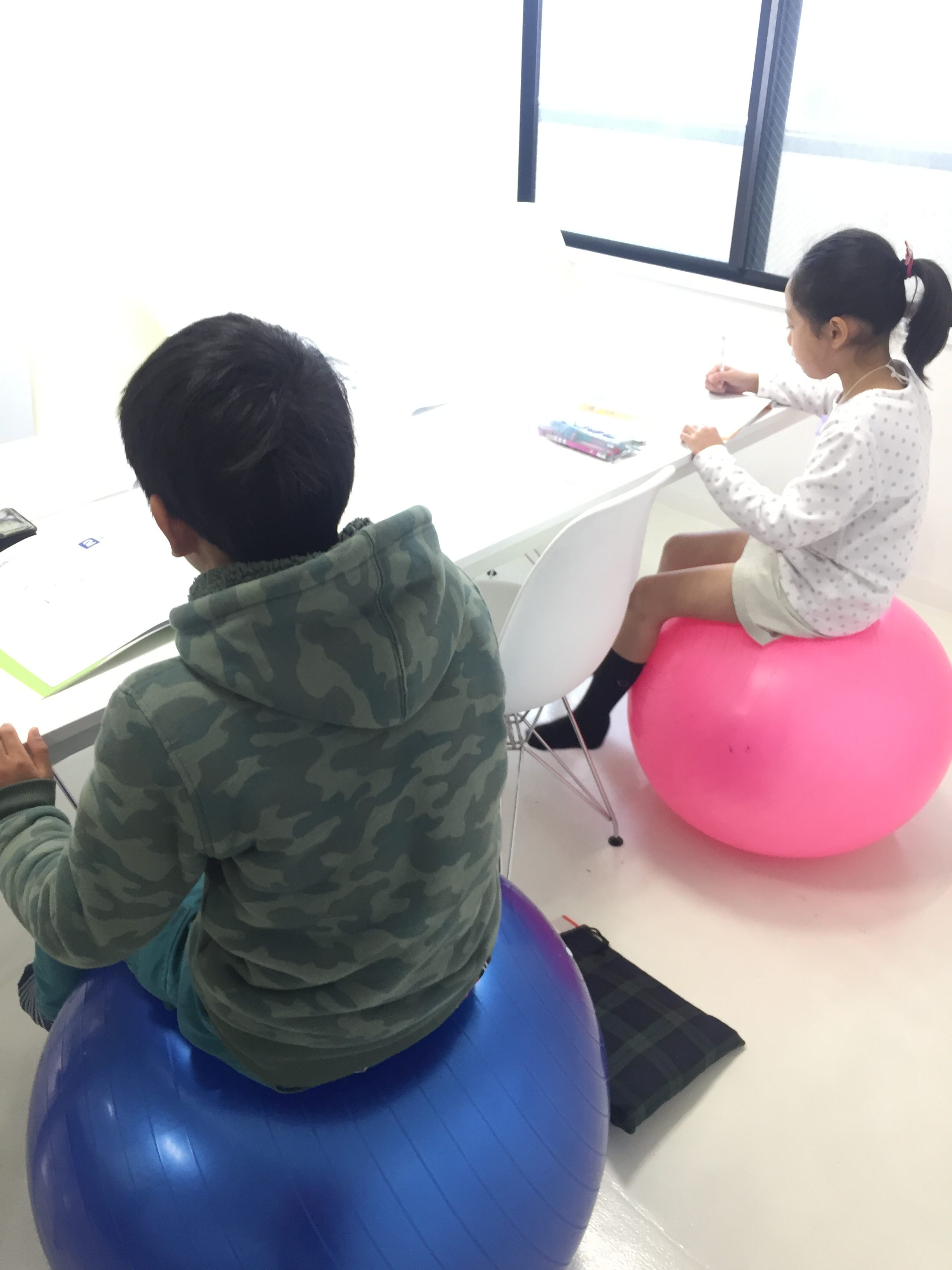 バランスボールに乗りながら、
