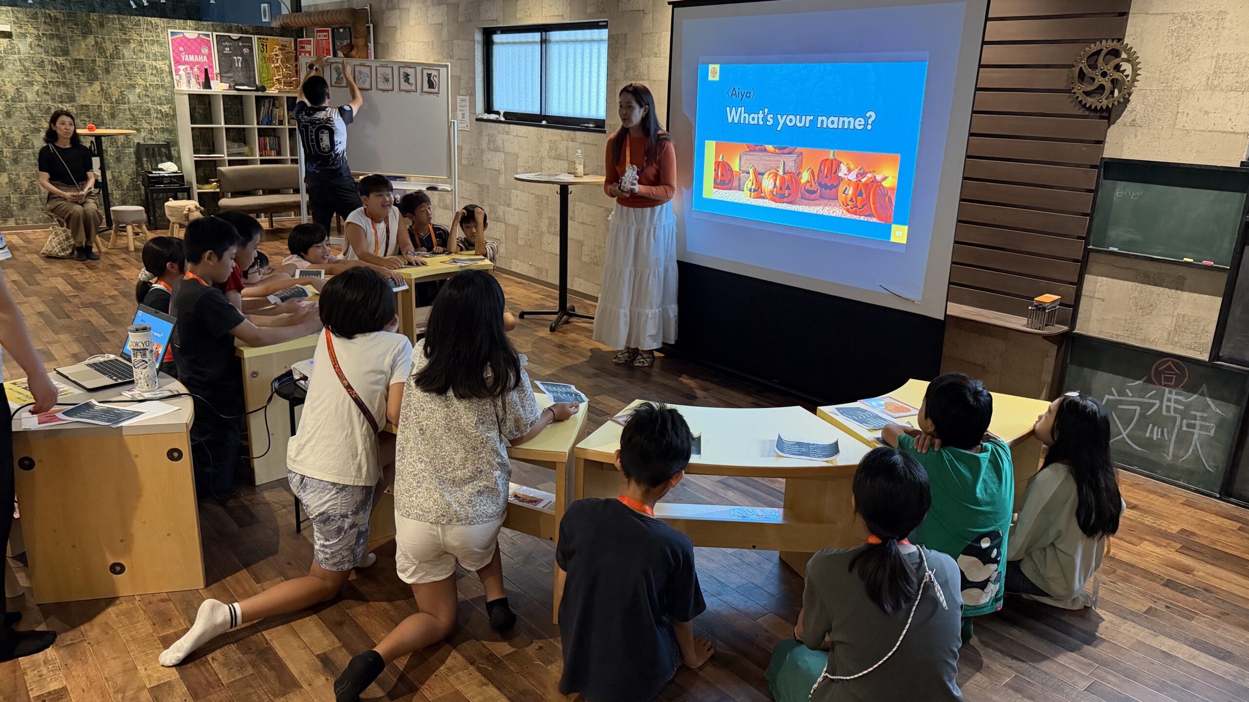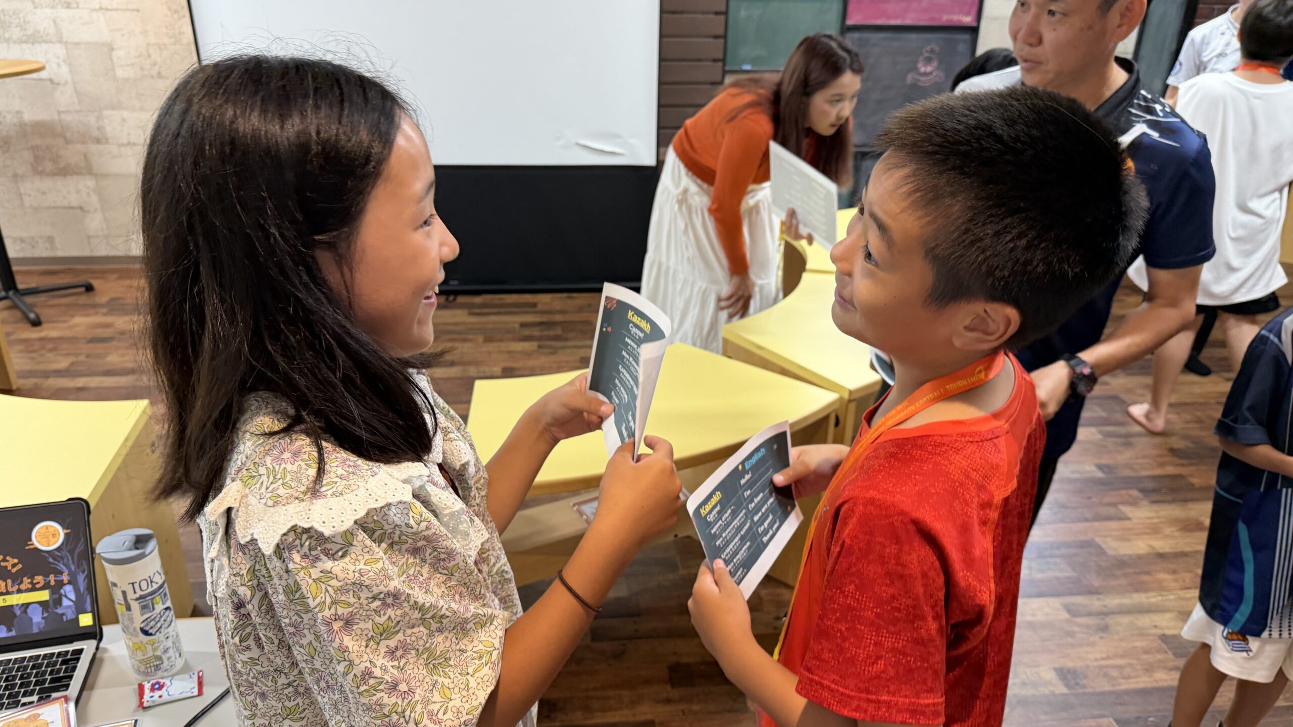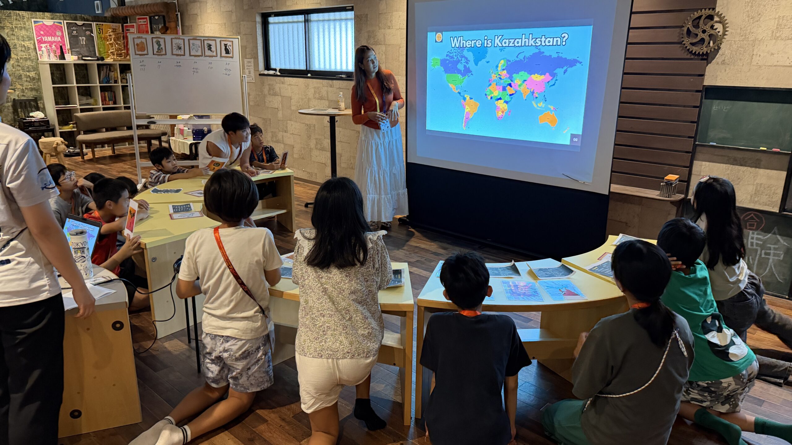 いつもは英語で挨拶していますが、カザフ語独特の音がおもしろいようで、みんなたくさんトライできていました!